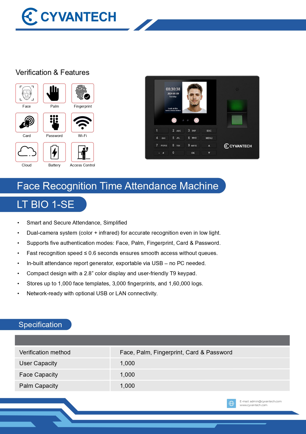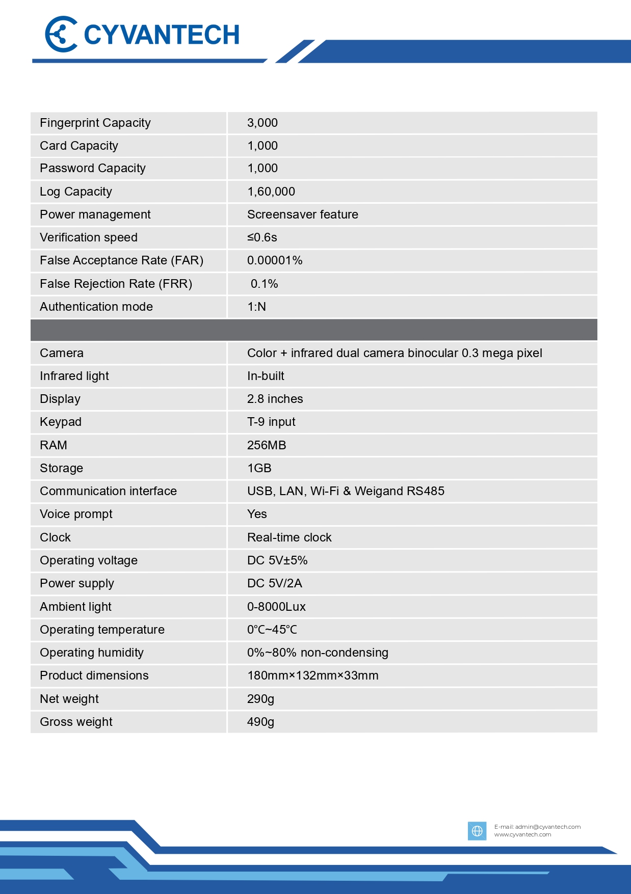 Wi-Fi biometric terminal with face (5,000) & card (5,000). Full access.