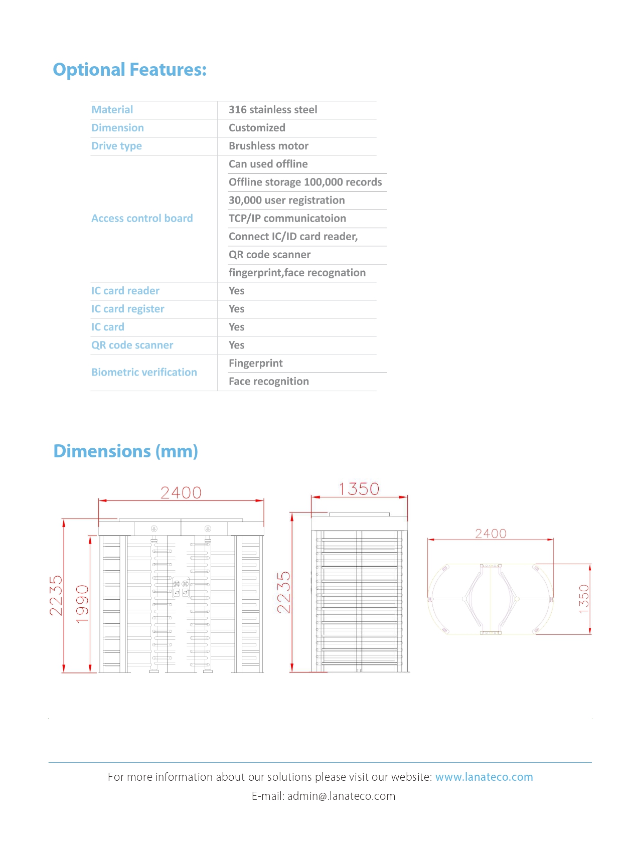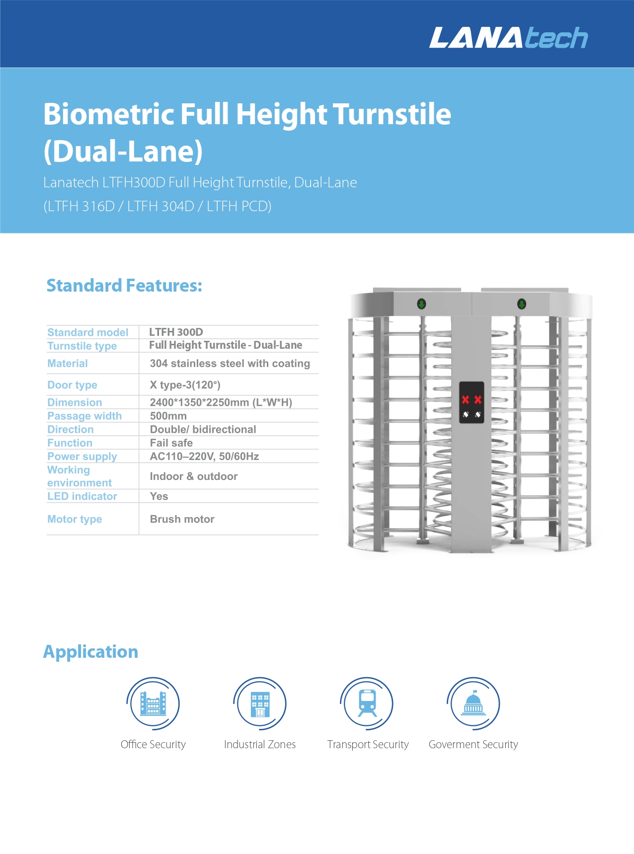 LTFH 300D is a double full-high turnstile and provides esthetic and effective control of entry or exit at kinds of toll collection systems like train/metro stations, and access control for commercial centers, stadiums, schools, government, and private sector buildings, etc.